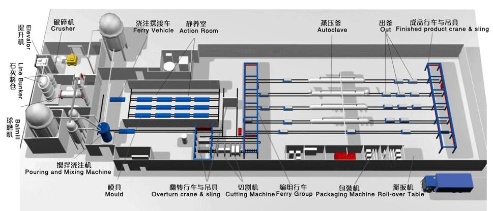 粉煤灰加气混凝土设备是以水泥,石灰,粉煤灰为主要原料,掺加发气剂,通过配料、搅拌、浇注、预养、切割、蒸压、养护等工艺过程制成的轻质多孔硅酸盐制品。因其经发气后含有大量均匀而细小的气孔,故名加气混凝土。