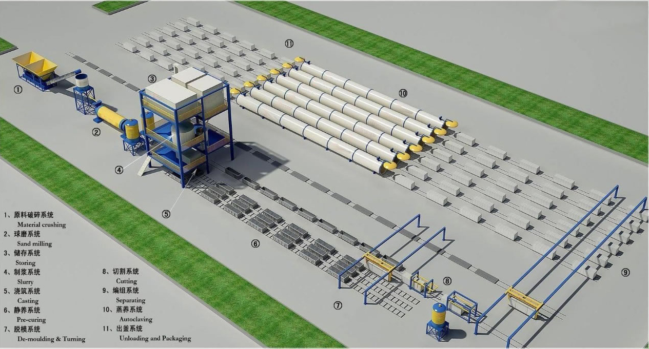 加气砌块设备将粉煤灰或硅砂加水磨成浆料,加入粉状石灰,适量水泥、石膏和发泡剂,经搅拌后注入模框内,静氧发泡固化后,切割成各种规格砌块或板材,由蒸养车送入蒸压釜中,在高温饱和蒸气养护下即形成多孔轻质的混凝土制品。