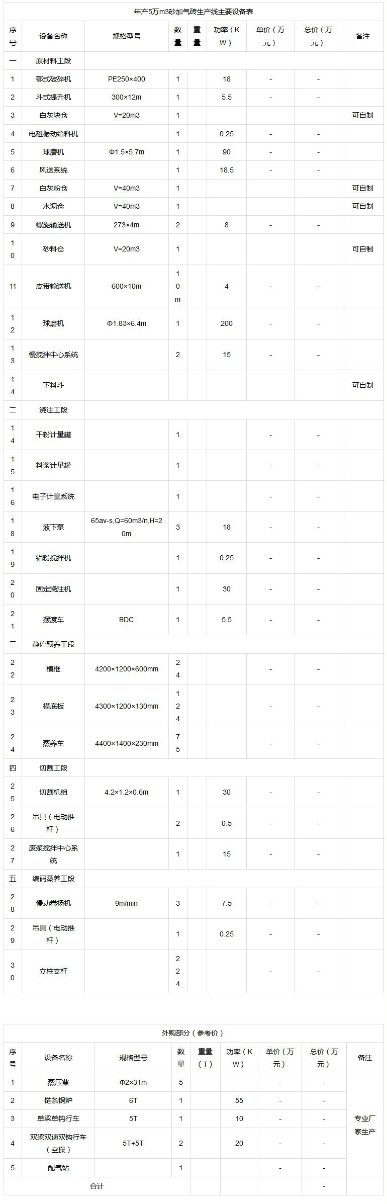 加气切块设备主要包括:球磨机,鄂式破碎机,皮带输送机,移动式搅拌浇注机,涡流制浆机,双钩同步行车,单钩行车,吊具,蒸养车,模框底板,提升机,切割设备,立柱支杆等设备。
